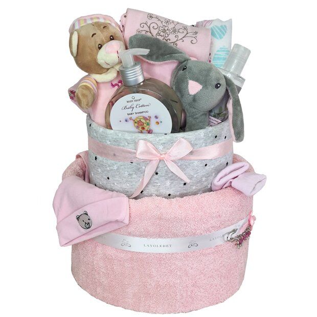 מתנת לידה מושלמת בצורת בייבי קייק שתי קומות מלאת סטייל.