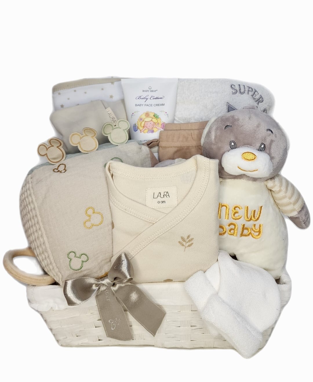 מתנה ליולדת מושלמת המכילה פריטים שימושיים ורכים לתינוק/ת .