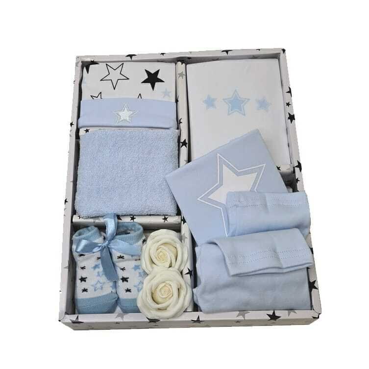 מתנת לידה בתוך אריזת קרטון מעוצבת המכילה ביגוד ראשוני ורך לתינוק