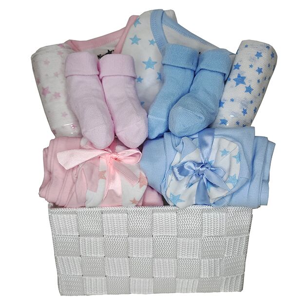 מתנה ללידת תאומים המשלבת פריטים רכים ושימושיים לרכים הקטנים.