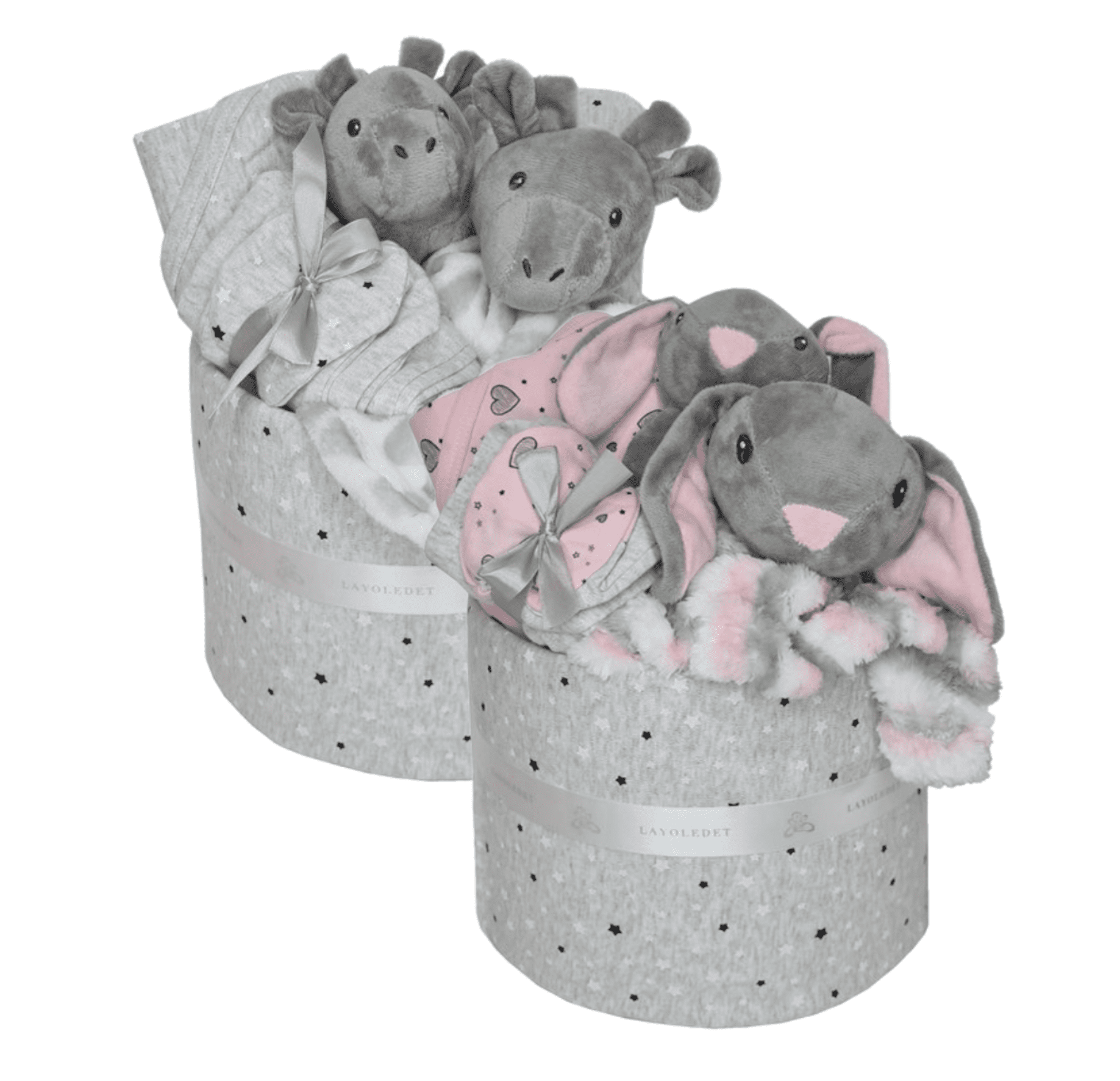 מתנה ליולדת תאומים המכילה בגדים רכים ושימושיים לתאומים שזה עתה הצטרפו למשפחה