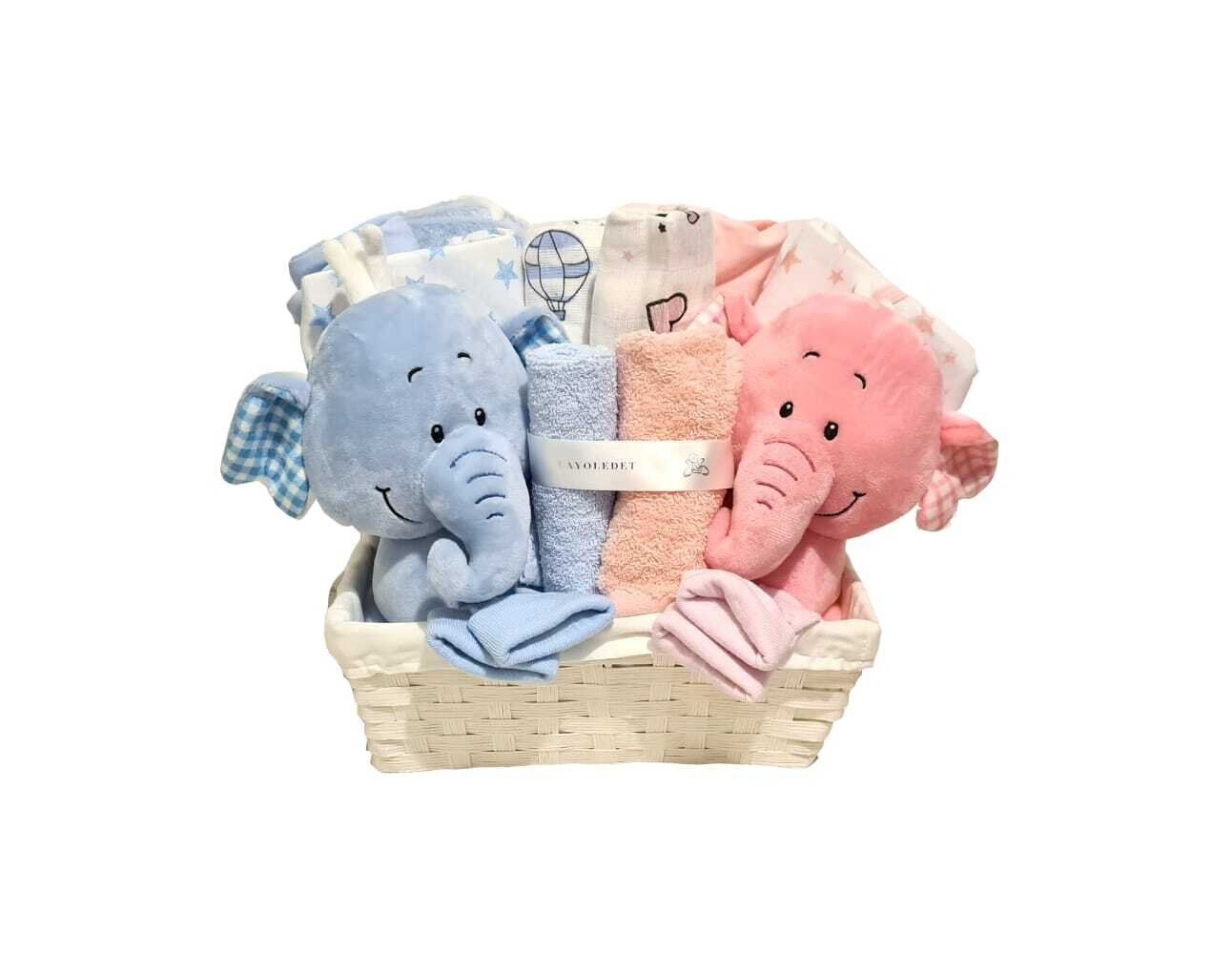 מתנה ליולדת בסלסלת קש מרופדת בד המשלבת פריטים יעילים המותאמים לתינוקות רכים משני המינים, הכוללת: