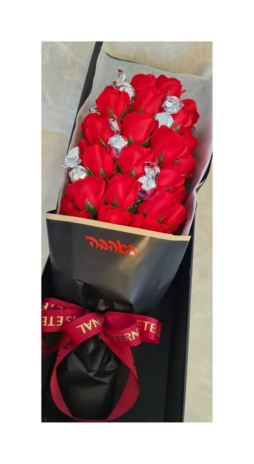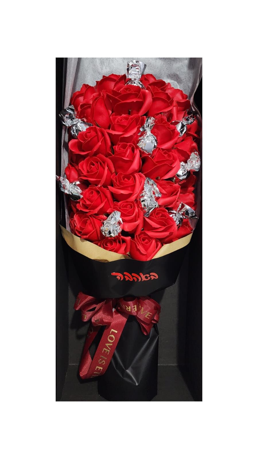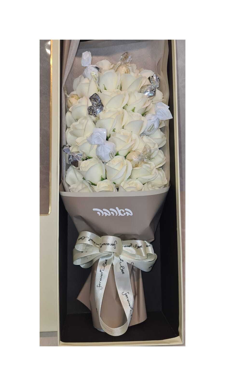 זר גדול מהמם המכיל 33 פרחי סבון ו10 פרלינים איטלקיים משובחים .
