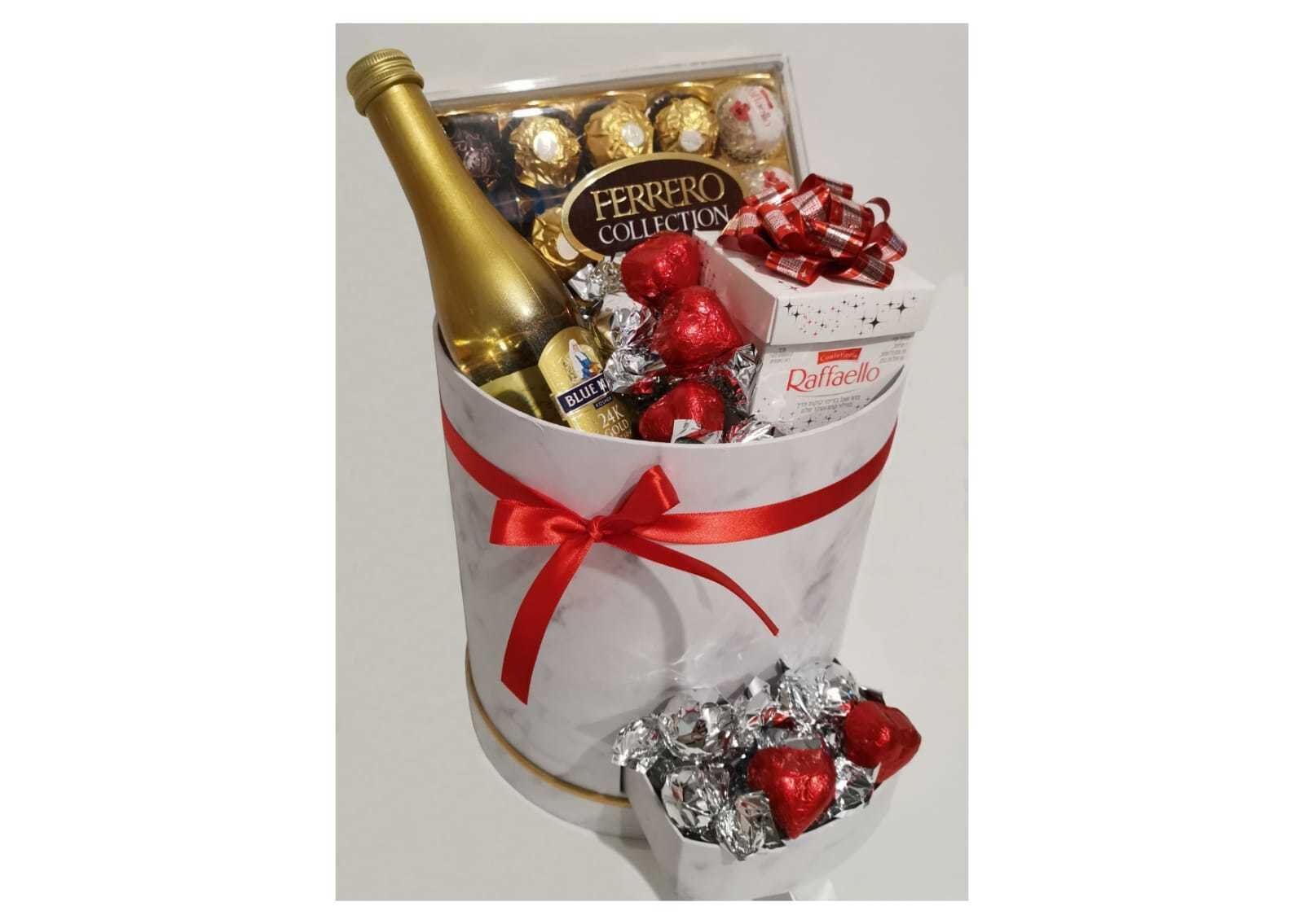 קופסא דמוי שיש יוקרתית עם מגירה נפתחת מלאה בשוקולדים ומיני בקבוק שמפנייה