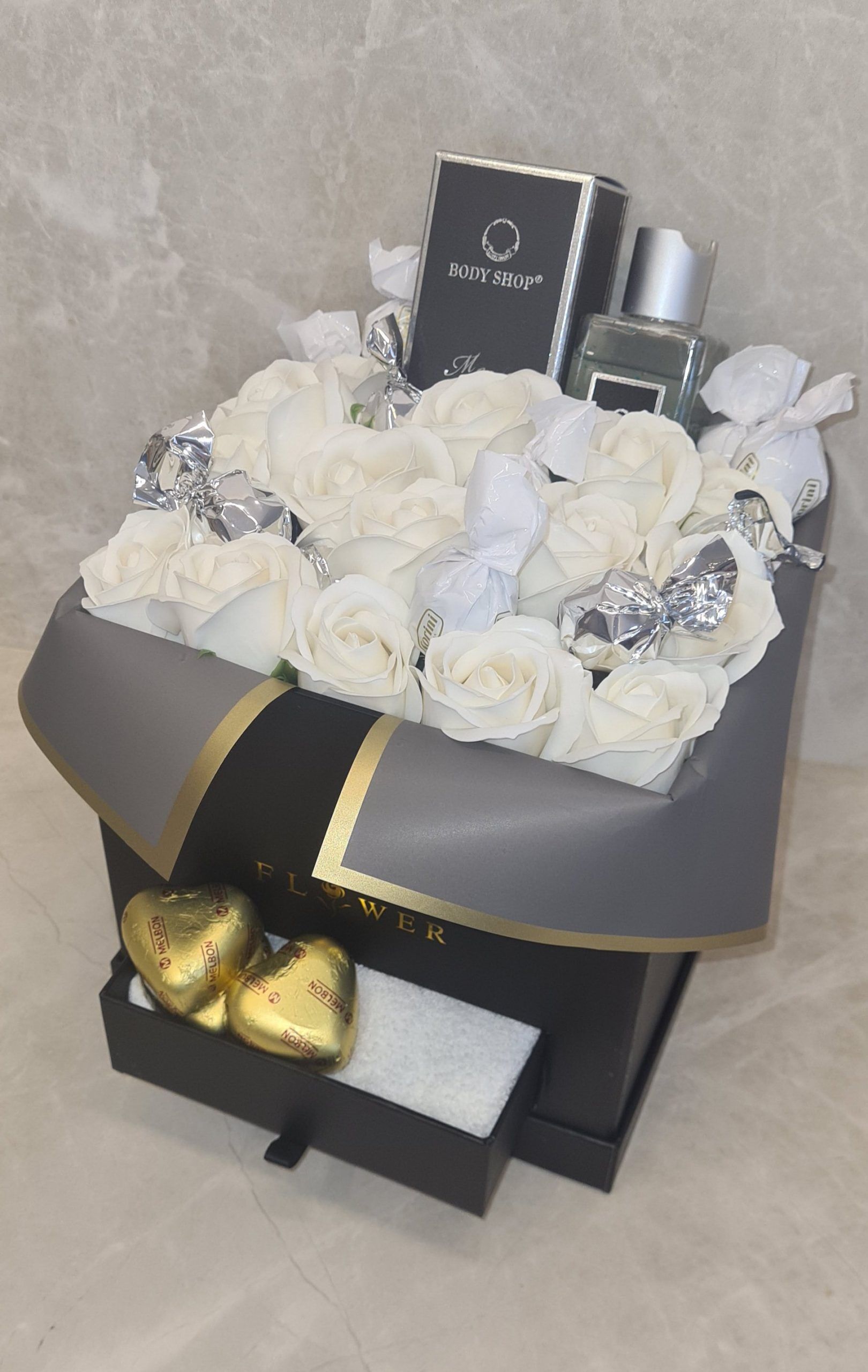 מתנה מהממת לאהוב/ה בקופסת לב בשילוב פרחי סבון ושוקולדים