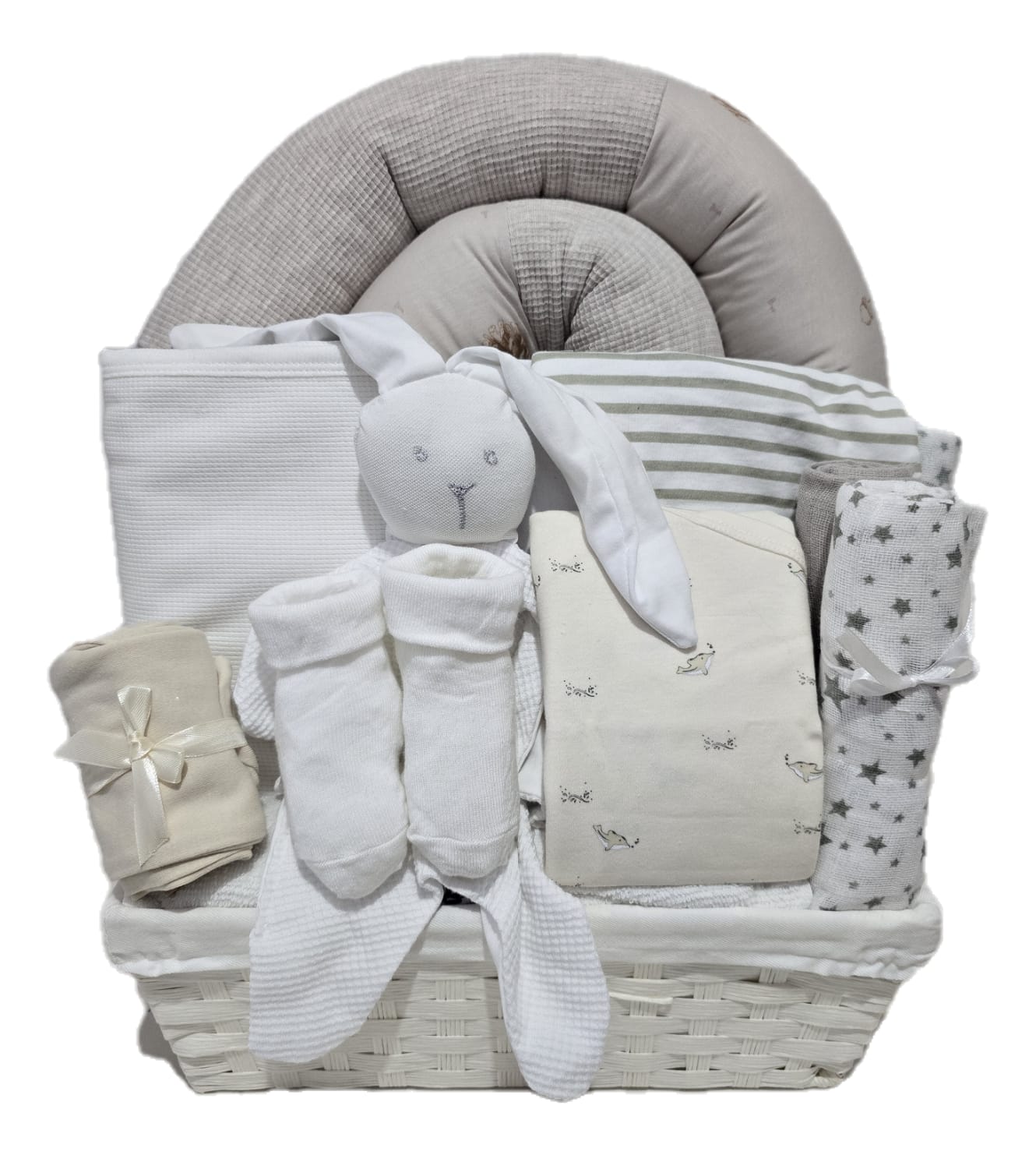 מתנה ליולדת בתוך סלסלה שימושית, מתנה גדולה ומרשימה במיוחד  המכילה פריטים רכים לתינוקות.