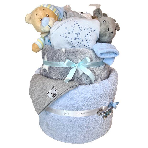 מתנת לידה מושלמת בצורת בייבי קייק שתי קומות מלאת סטייל.