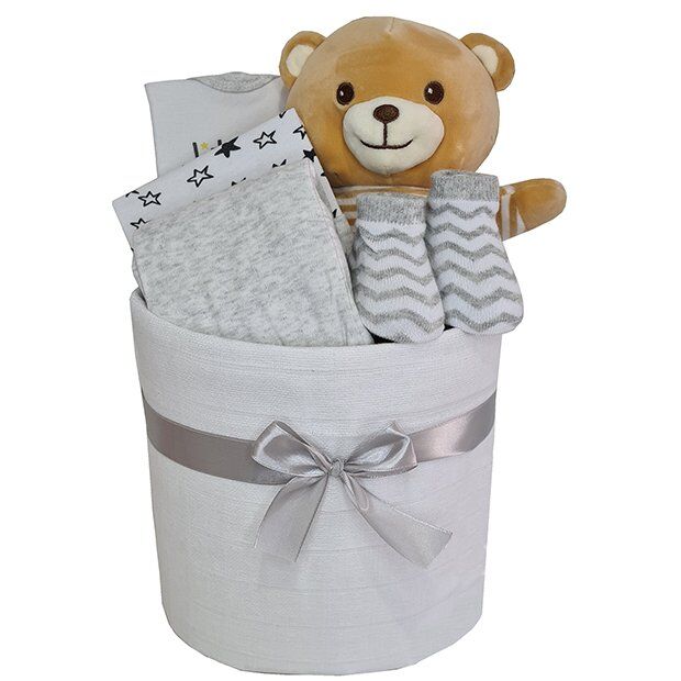 שי ליולדת בעיצוב עוגת קומה אחת ובתוכה פריטים רכים לתינוקות משני המינים