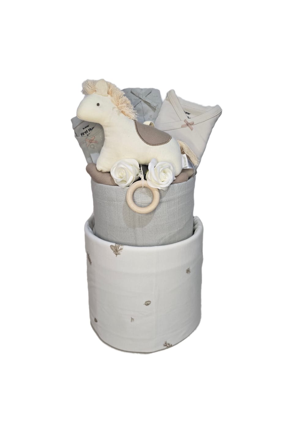 מארז מעוצב בצורת עוגת שתי קומות, הכוללת בגדי תינוק איכותיים, מובייל מנגן ועוד… כל מה שיולדת צריכה ובשיא הסטייל.
