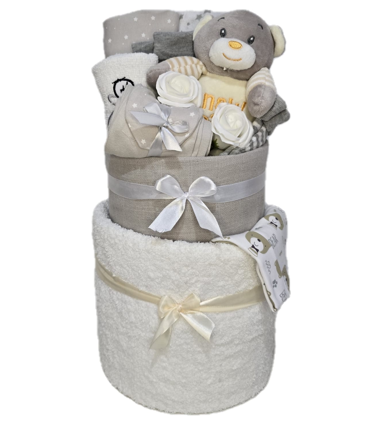 ערכה ליולדת המעוצבת כעוגת שתי קומות מקסימה עם פרחי משי ופריטים שימושיים לרך הנולד