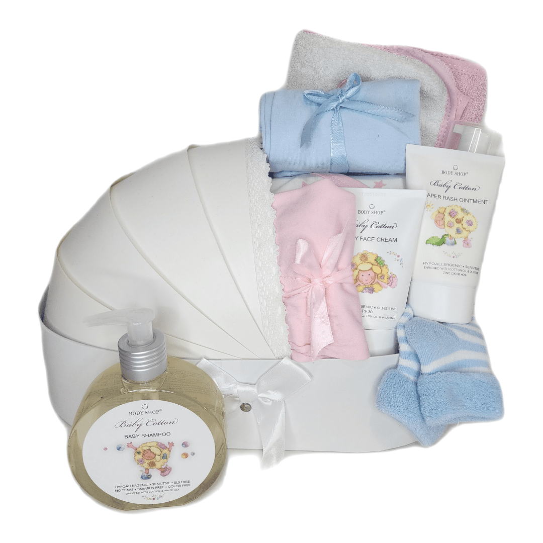 מתנה ליולדת תאומים בקופסת עריסה מעוצבת המכילה ביגוד ראשוני לתינוקות ומוצרי טיפוח.