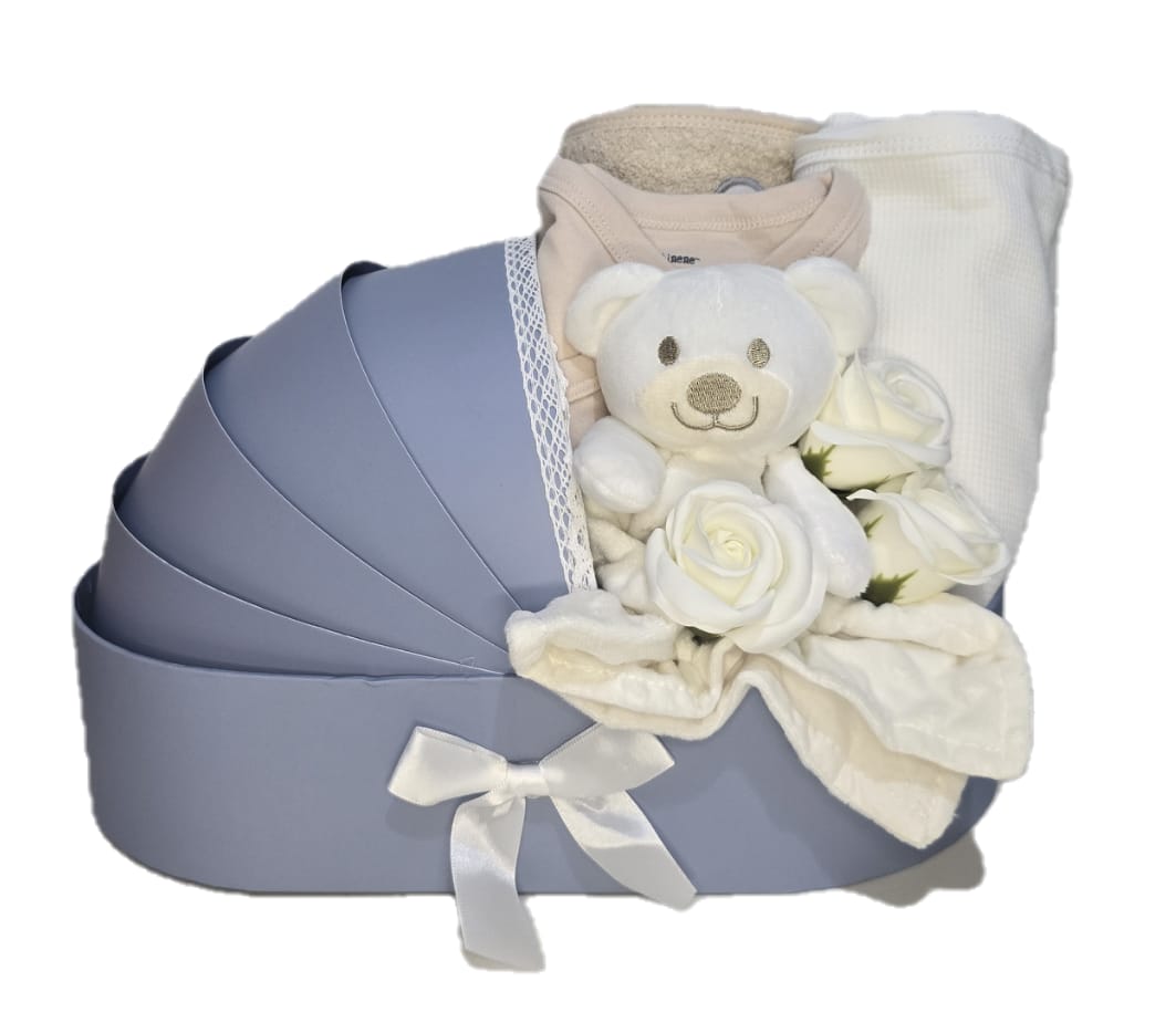 מארז מעוצב בצורת עגלת תינוק, הכולל בגדי תינוק איכותיים, שמיכה רכה, דובי מפנק ופרחים לקישוט – שילוב מרגש של פרקטיות וסטייל.