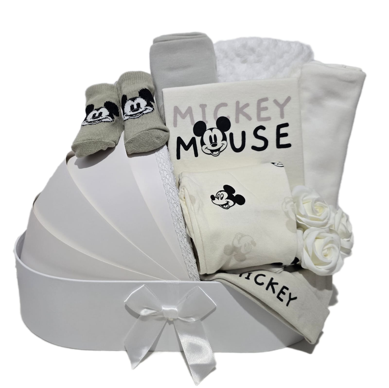 מתנה ליולדת בקופסא דמוי עריסת תינוק המכילה בתוכה פריטים רכים מבית המותג דיסני