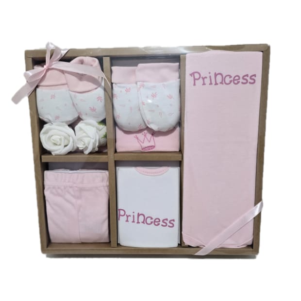 מתנת לידה בתוך אריזת קרטון מעוצבת המכילה ביגוד ראשוני לתינוקת