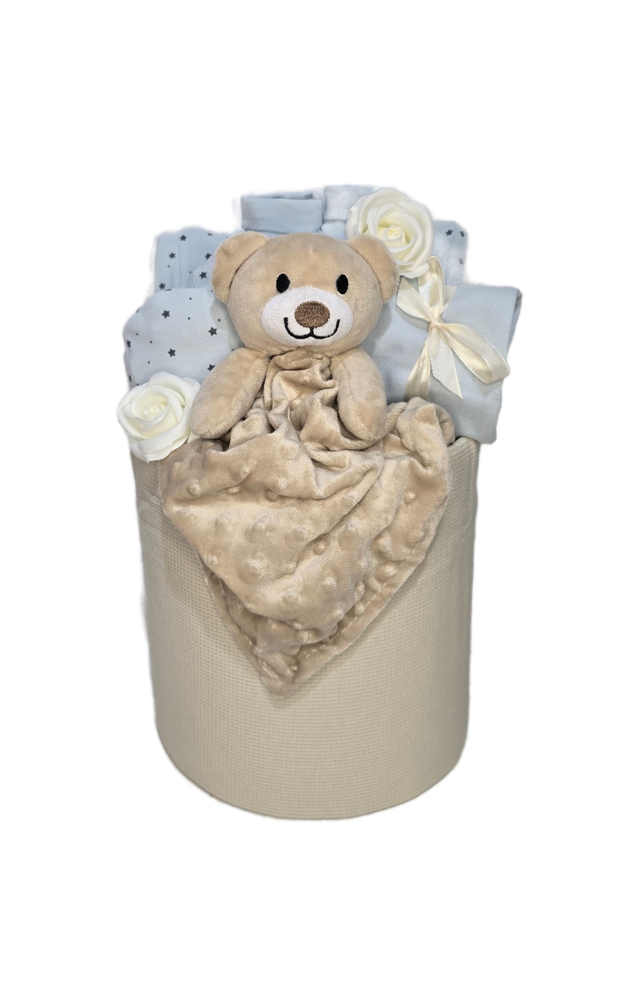 עוגת מתנה ייחודית בעיצוב אלגנטי הכוללת שמיכי דובי עם מגבת איכותית לתינוק וביגוד ראשוני.