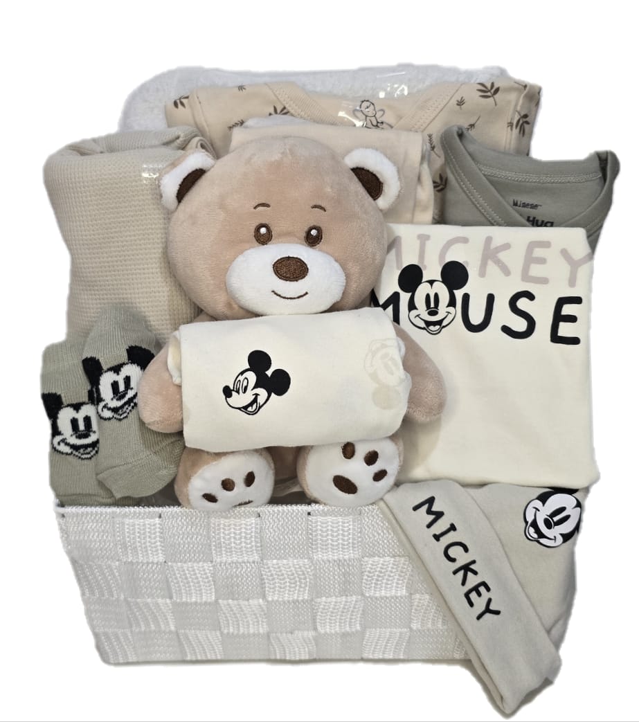 סלסלת קש מלאה בפריטים שימושיים לרך הנולד בשילוב פרטי לבוש של “דיסני” .