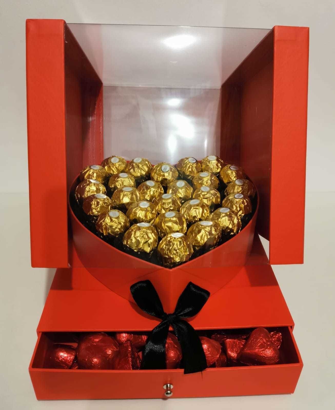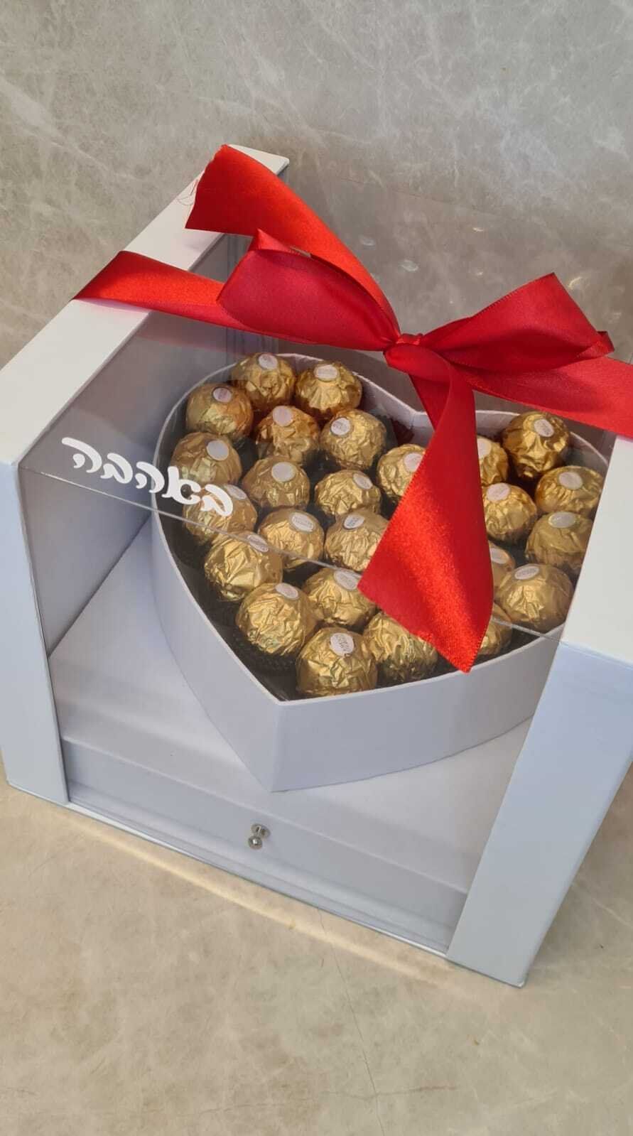 קופסא שקופה עם לב מלאה בשוקולדים , המארז מכיל: